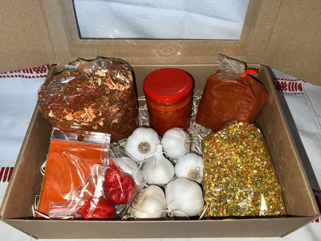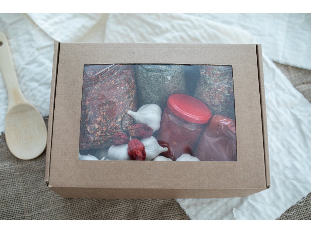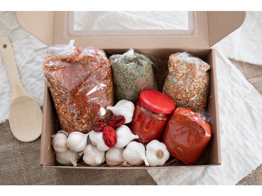 Obsah: gulášová zmes 500g, paprika pálivá 200g, papriková pomazánka jemne pikantná, domáca vegeta bez soli 200g, cesnak jarný 500g, majorán sušený alebo petržlenová vňať sušená podľa výberu DARČEK, chilli paprička Carolina Reaper DARČEK